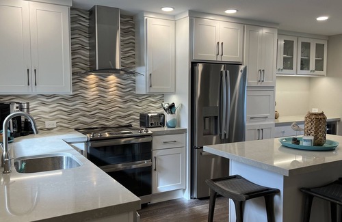 All NEW appliances! Completely renovated kitchen. All new stainless appliances including dishwasher, sink, French door refrigerator, double oven range, sleek glass vent hood and microwave (hidden behind door in pantry cabinet).