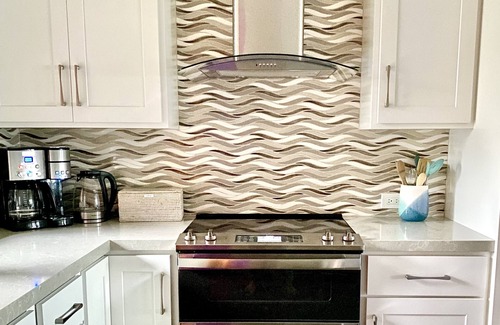 Huge working island with ocean view seats three comfortably and has all the necessary meal prep utensils and supplies stored easily within reach. Coffee station with drip & pod coffee maker, hot water kettle, coffee grinder and an assortment of teas, pods & sweeteners provided (supply varies based on private or guest use). Crockpot, air fryer and waffle maker for your use.