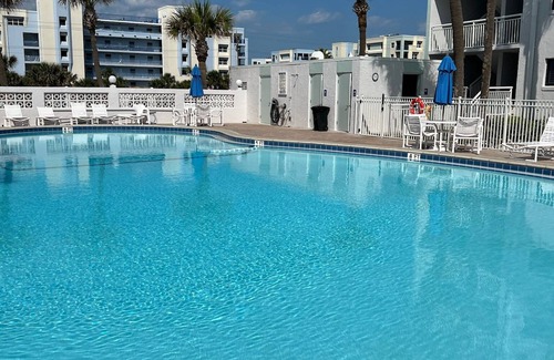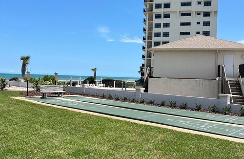 Shorehom by the Sea Unit 28 — Enjoy NSB in this two bedroom beachfront family-friendly condo. Located directly on the beach, no crossing roads etc to get there. Fully stocked kitchen. Beach necessities such as towels, chairs, umbrella, beach wagon, beach toys! Second floor condo, BBQ grill & shuffleboard court right outside front door. Large swimming pool and grass area that can be used for hanging out and playing corn hole. Private washer and dryer. Self check-in. Free parking on site. This is a smoke free and pet free complex.
