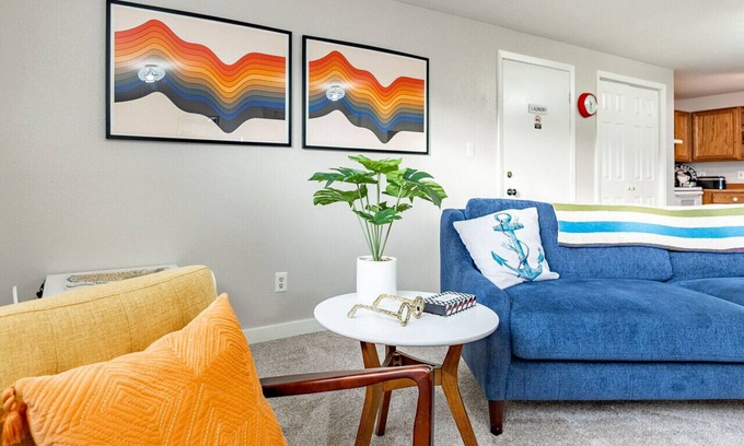 The apartment includes a fully equipped kitchen with retro appliances, a cozy living room, and comfortable Queen and Twin bedrooms. With a private entrance and ample parking, Shoreline #5 provides everything you need for a relaxing stay.