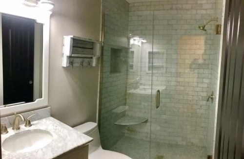 Both bedrooms share a fully remodeled bathroom, complete with a frameless glass door, stunning Carrara marble tile, and a beautiful Carrara top vanity for added luxury.