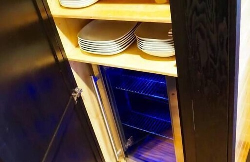 Shorepine features a beautifully appointed queen bed, a full kitchen with induction burner, two mini fridges, and a full bathroom with shower.