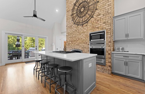 Culinary enthusiasts will delight in the fully equipped kitchen featuring a gas range and trendy barstool seating. And when it's time to relax, the recreation room awaits with a pool table, bar, sprawling sectional, and a movie night-ready TV. There’s also ping pong, corn hole, and outdoor Connect 4 for even more fun.
