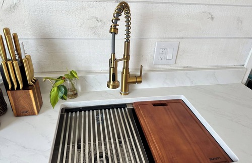 There’s an official bedroom upstairs & a quaint kitchenette. In the living area there’s also a couch made to sleep 2 small children or 1 adult w/ a 55” TV. Downstairs is a high end king size sleep sofa. There’s plenty of room downstairs to open up the ping pong table and enjoy the 65” TV.