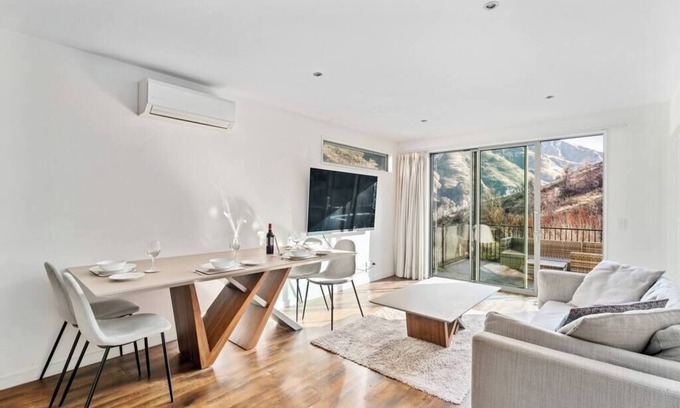 Our stunning Queenstown retreat is the perfect haven for families or couples, featuring two large and comfortable bedrooms with built-in closets. The open-plan living, dining, and kitchen areas create a seamless flow, ideal for relaxation and socializing. The modern kitchen is equipped with all the essentials, including a microwave, smoothie blender, and toaster, making mealtime a breeze. Bask in the stunning views of the mountains and Shotover River as the sun rises and sets, casting a kaleidoscope of colors across the landscape. Take a leisurely walk along the river or stroll along the ridge overlooking the mountains and river, offering breathtaking vistas.