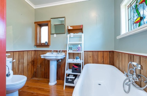 Shy Cottage is a stand alone 1890's settlers cottage, nestled at the back of our property, which allows for privacy and peace and quiet. It was moved onto the section in 2002 and was renovated and insulated so now is cosy, warm and romantic. There is a full kitchen with a dining area and lounge with a wood burner. Off the comfortable bedroom is a lovely bathroom with a claw foot bath and separate shower.