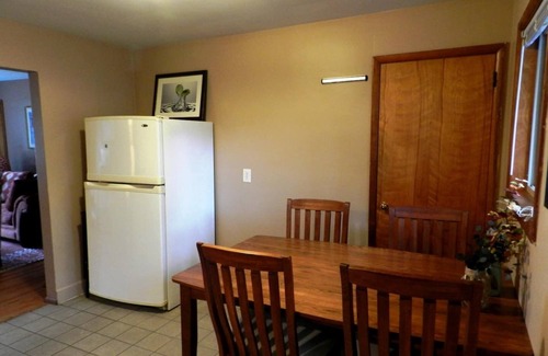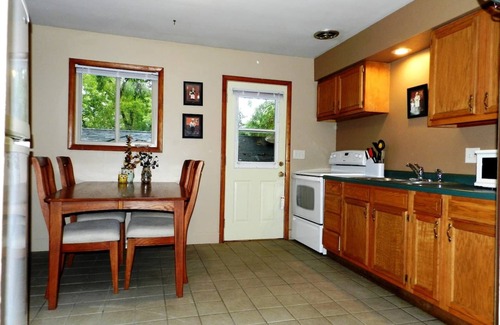 Open layout two bedroom with updates of kitchen, windows, roof, siding, insulation. Offers exclusively wood & tile floors for natural surfaces and healthy living. Private entry. Deck, off street parking, yard and optional laundry for use. In addition to the three beds there is a futon (sofa bed) and a couch in the living room. Also cots, child mattress, and air mattresses are available for use.
