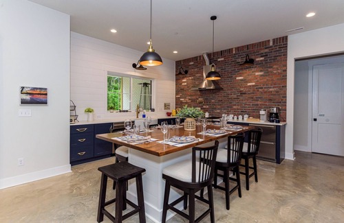 AT THE COTTAGE you can expect luxury finishes, spa-like bathrooms, and a unique industrial-chic design that sets the tone for a high-end yet comfortable stay. With a unique split floor plan, immerse yourself in the primary suite (w/king bed), featuring a luxury style bath, private seating area and flat screen TV, while your family or guests enjoy the seclusion of a private guest suite w/2 additional bedrooms with shared bath. One bedroom features a queen bed and the other a flex space with 2 daybeds, flat screen TV and additional workspace. You’re going to LOVE gathering in the great room and gourmet kitchen that’s fully equipped for everything from pancake breakfasts to crab feasts. Then slide over to the conversational room to enjoy a cup of coffee or cocktail! — spacious common areas, comfortable furnishings, and a layout that balances togetherness and privacy.