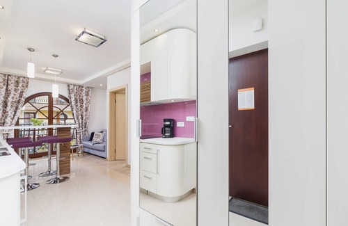 This fully equipped, luxurious apartment is suitable for 4 people. It consists of a living room with a sofa bed and a bedroom with a double bed. Each room has a Smart TV. Guests also have access to a kitchenette equipped with the necessary appliances for preparing meals, such as a microwave, dishwasher, and coffee maker, as well as a bathroom with a shower. The apartment also has two balconies overlooking the courtyard and electric underfloor heating. For guests with cars, private parking in the garage is included in the price.