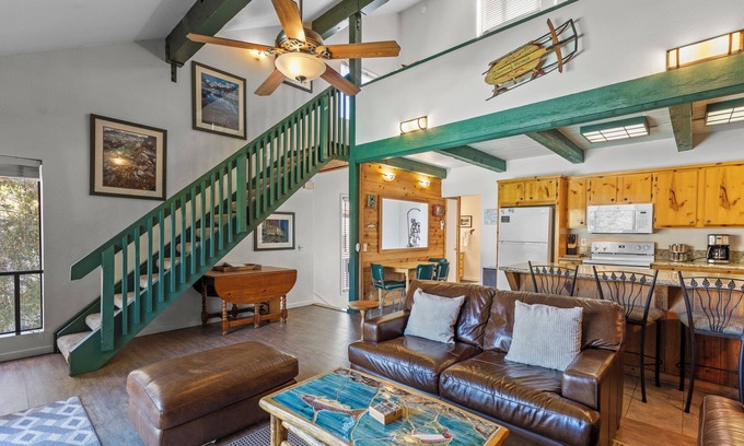 Upon entering this townhome, you'll find a primary room on the first floor, along with a convenient mudroom and a washer-dryer for added practicality. Head upstairs to the living area, where you'll encounter two comfortable leather sofas and a TV. The open-concept kitchen is fully equipped and features bar seating, as well as a small table for four. From the living area, step out onto the balcony, which offers splendid views of June Lake. Another bedroom on this level features a queen bed. The loft on the third story provides additional sleeping space with two queen/twin bunk beds. This townhome is well-appointed and offers a comfortable space for your stay in the beautiful June Lake area.