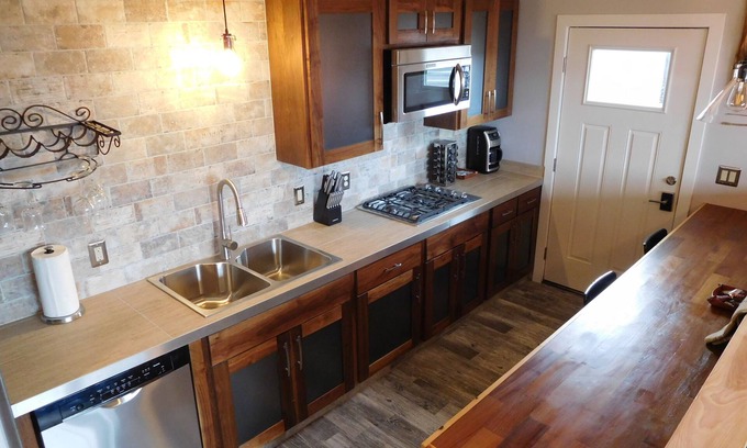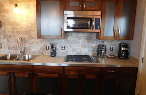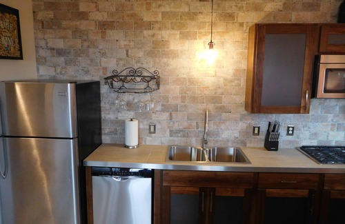 As you enter the bungalow, you see the attention to detail. The room has a contemporary feel, with a strong accent of the industrial age. The main room is very open, with a kitchen that comes well-equipped with high-end stainless steel appliances. It has a full-size refrigerator, double-bin sink, a very nice gas cook-top, a large convection microwave, and a dishwasher . It also has a toaster oven, automatic coffee-maker, and everything you would need to cook a wonderful meal. There is a breakfast bar that seats 4 people. It adds extra counter top space, or you can enjoy your meals there.