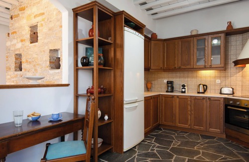 The ground floor hosts the fully-equipped kitchen with ceramic tableware and a dining space and table. A traditional sofa bed can be used upon guests' request as a large double bed. A bathroom with shower and a small storage place is also available. Moreover, the visitor can relax in the large cozy living room with television set, chess and a selection of books.