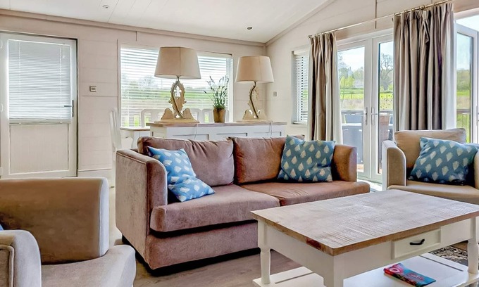 This is a stunning, two bedroom lodge with a super king-size bedroom with en suite, and one twin bedroom with en suite. Open plan kitchen, diner and lounge area, complete with French doors which open out onto a decking area, which finishes off with stunning country views. The master bedroom has patio doors which open up to the hot-tub.
