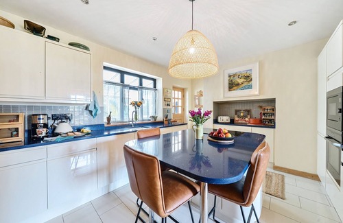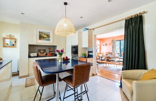Dating back to 1935, this impressive and stylish Art Deco house offers generous accommodation for up to eight guests, with attractive décor and furnishings throughout. On arrival you will step into the hall, off which you will find the beautiful sitting room where you are invited to relax on comfortable sofas in front of the open fire, or to step out onto the terrace to enjoy the large garden. A well-equipped kitchen with central island and breakfast bar sits next to the family dining room where you can enjoy meals together in this sociable space. Further along the hallway you will find a cloakroom, and the first of four well-appointed bedrooms; a large double bedroom with garden views and an en-suite bathroom with shower.