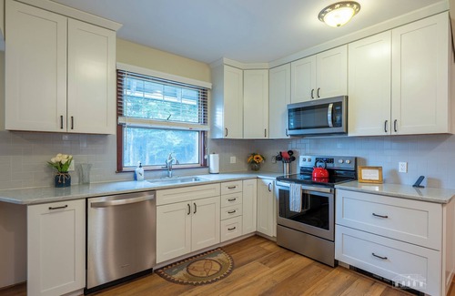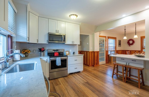 This home boasts five bedrooms, 3.5 baths, and a well-equipped kitchen that was re-modeled in 2019 and outfitted with all new appliances, along with a fully remodeled and upgraded master bath in 2023. The large dining room and two living spaces with TV, Smart TV with spectrum cable access through the provided Roku, a variety of board games and cards available in the dining room closet, a sectional couch, and a gas stove allow ample gathering and private space for up to 12 people. The Dining Room seats 12 at a beautifully locally sourced and crafted, live-edge wood dining room table and the all-season porch has a sitting area with a TV, Pool Table and Foosball Table. The patio with enough tables and chairs for all, along with the large partially fenced yard provides plenty of outdoor space to relax, grill, and enjoy the seasonal views of the mountains and lakes.