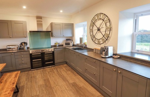 Amenities: Eco heating, underfloor heating, woodburning stove. Range electric oven and hob, fridge/freezer, toaster, kettle, dishwasher, coffee machine, washing machine, tumble dryer, TVs, sound bars, a selection of books and games and WiFi. Fuel and power inc. in rent. Bed linen and towels inc. in rent. Highchairs and stair gate. Off-road parking for several cars. Lawned front garden with lower patio area with furniture and hot tub. External games room and gym with a pool table, juke box and a multi-gym. Electric vehicle charging point available. Sorry, no smoking. Shop 1.5 miles and pub 1.6 miles. Note: Sorry but there are parts of the grounds not to be used by guests which will be clearly shown in your welcome guide but please be assured this will not detract from your holiday experience. Please note: Check in time is from 5pm.
