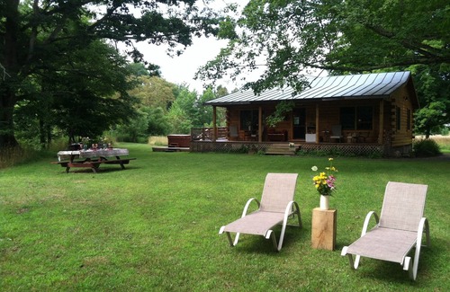 The tastefully decorated cabin includes a master bedroom with queen bed, a second bedroom with two twin beds, one bathroom with laundry, a fully equipped kitchen, open living/dining area with cozy wood stove, a covered porch and a deck with hot tub and outdoor dining area with a gas grill. At the Cabin on Back Creek, you can enjoy the stars which light up the night sky, bird-watching, walking, or just relaxing with a book in the hammock, on the porch, or on the deck. In the early spring, we make maple syrup at the sugar house located adjacent to the Cabin. You are invited to watch (and smell!) the process of turning 50 gallons of sugar water into a gallon of pure maple syrup - or you can help us if you would like!