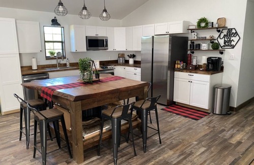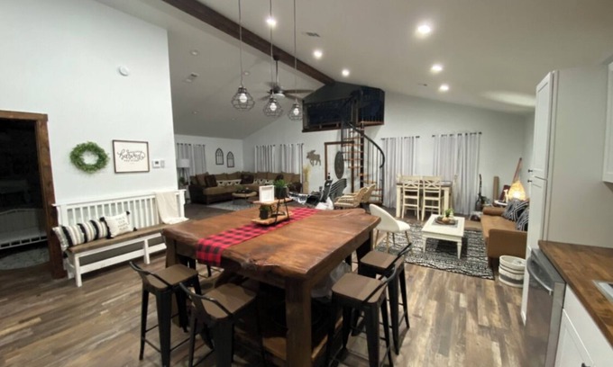 At the end of the day, after all your adventures come back to the cabin to relax. The open floor plan allows everyone to spend quality time together whether in the kitchen cooking or taking it easy in the living room. The cabin’s decor gives it a cozy feel. It comes fully equipped with all the necessities to make it feel like home away from home. It includes a washer, dryer, dishwasher, refrigerator, stove, oven, microwave, coffee maker that has both carafe and k-cup, bed and bath linens, all the kitchen basics, a charcoal grill, and TV’s with Dish Network. No wifi available. Good cell phone reception. The cabin sleeps 12 people. It has 2 bedrooms that both have queen size beds. It has a bunk room that has 2 sets of full over full bunk beds (top bunks should only have one person and no one under the ago of 6 years old on top bunk). Use bunk beds at your own risk. A spiral staircase leads up to the loft overlooking the living room. The loft has 2 twin size beds. The cabin has 2 full bathrooms. The living room has a large sectional. There is an additional lounging area with a sofa. We have two tables for dining. One table has 8 chairs and the other table has 4 chairs. The cabin has a covered front porch. There is a fire pit with chairs and a picnic table outside. We have a number of board and card games available. Wake up and look out the windows to possibly catch a glimpse of the local wildlife. Another cabin (Simply Buffalo) which sleeps 10 is located on the property about 100 yards away. It may also be available for rental if needed.