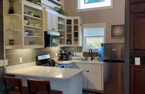 Upstairs is a king size bed, and sitting area with television and Direct TV and wifi, and a beautiful view out the windows. Downstairs is a sitting area, full kitchen with refrigerator, stove, oven and microwave, and breakfast bar. Small bathroom with a shower and small size washer and dryer. Filtered rainwater collection system.