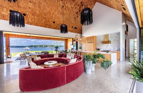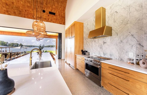 The property boasts an array of outdoor spaces that encourage relaxation and fun. The elegant dining terrace is the heart of the outdoor living area, where guests can enjoy meals while basking in the natural beauty surrounding them. Adjacent to the terrace is a fully equipped al fresco kitchen, ideal for preparing fresh, lakeside meals. Picture cooking up a feast while still being able to engage with your friends and family as they unwind nearby.