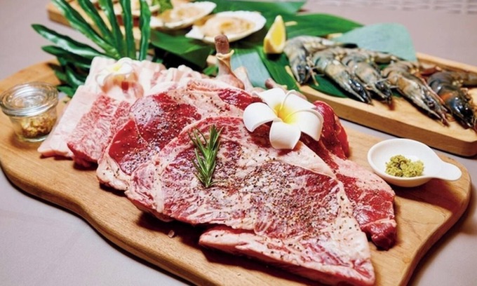 BBQ American loin steak domestic pork belly domestic chicken thigh bonein sausage and a vegetable platter