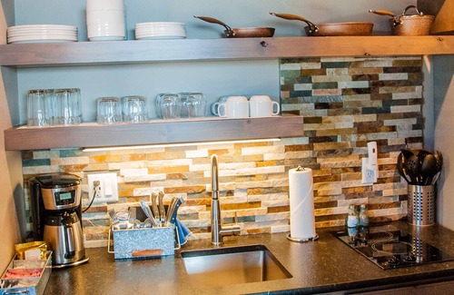 Our Single King Cabin features 1 bedroom with a king bed and flat screen TV with cable. The full sized bathroom has a spa-style rain shower head and floor to ceiling tile. The kitchen includes a refrigerator and freezer, sink, microwave, two burner stove and coffee maker with complimentary coffee. The living room has a sofa, large screen TV, as well as a gas fireplace that can be enjoyed from inside or outside on the private patio. The Single King Cabin has a maximum occupancy of 2 guests.