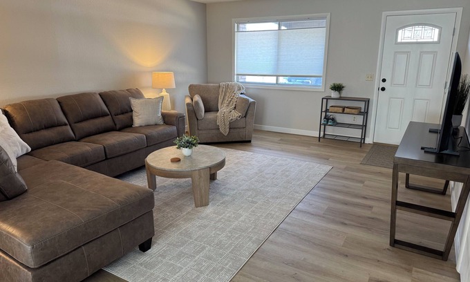 Idaho Falls is waiting for you at this cozy and clean townhome. All new furnishings, flooring and paint in this beautifully updated 2 bedroom, 1 bath Single level home. The layout is efficient and the home is stocked to meet all your needs for a comfortable extended stay. This unit is separated from the adjacent unit by two garages so you will never hear any noise from your neighbor. Located on a cul-de-sac and close to major shopping, dining and hospitals. Private attached 1 car garage and ample parking. Enjoy the summer months in the private backyard.