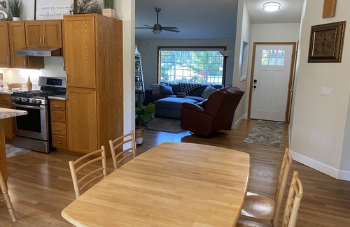 This dream of a home is a single story, three bedroom, two bath, vaulted open floor plan with front and back decks. Unwind with the privacy and traffic-free cul-de-sac you deserve, where seating is provided on both decks to enjoy the large, private lovely yard and landscaping. The inside décor is wonderful; it’s upbeat and smooth, where the natural light shines in. The bedrooms are large and relaxing to comfortably accommodate 5 people. Master bedroom has an attached full bath. Cook and entertain in the kitchen with the enjoyment of everyone gathered, in this spacious, fully functional area with granite counters and stainless appliances. Cozy up in the well-appointed living room with a large SMART T.V. and electronics, gas fireplace, recliner, and couch. The comfort of this home is of the highest level. Conveniently located to a variety of stores, restaurants, attractions, and entertainment. Quick Interstate-5 (I-5) and downtown access, minutes escape to the surrounding territorial hills and wine country. Come relax at this getaway of 3 bedroom home in south Salem, Oregon offering plenty of peace and quiet!