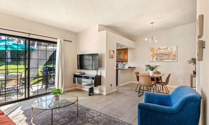 There are two private patios - one facing the pool (close but not too close) and the other looks out to the San Jacinto Mountains. Your patio has a BBQ and table and chairs for those fabulous Palm Springs nights. The unit comes with a washer and dryer and everything you need for a fantastic vacation. mesquite has beautiful walking trails and it’s just across the street from the golf course clubhouse.