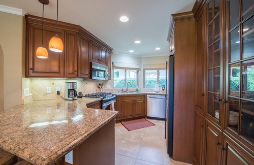 The gourmet kitchen has everything you need to whip up 4-course meals or a quick breakfast or lunch. New stainless steel appliances include a GE Profile 4-burner gas stove and a Whirlpool dishwasher along a paneled side-by-side refrigerator with a front ice and water dispenser accompany the well-stocked kitchen.
