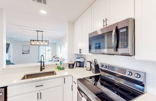 The single-story interior boasts all-new decor, furnishings, and appliances to ensure every bit of carefree convenience throughout your stay. A small screened porch offers a cozy spot for morning coffee, or you can stretch out in the spacious side yard for some sun-soaked happy hour entertainment. All-new kitchen appliances are equipped for stress-free meal prep and a dishwasher is included for quick cleanup. Comfortable seating and a smart TV welcome casual downtime in the living room. Home essentials include free WiFi, central air-conditioning, and a private washer/dryer.