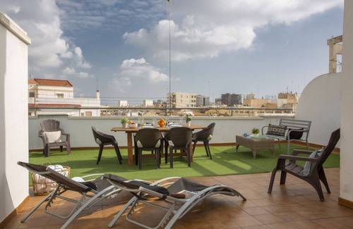 This spacious apartment for 12 people consists of 4 bedrooms and 3 bathrooms. It has a spectacular terrace fully equipped with comfortable furniture. It is a perfect choice for a good holiday in this city. It is very bright and cozy, and also has two parking spaces in the same building.