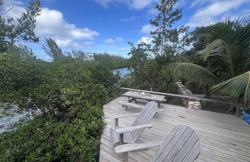 This space is elevated high in the treetops and includes a 36ft fully screened veranda. Many of the furnishings in this house are handcrafted. The house is tastefully decorated with driftwood and a perfect blend of rustic tropical, comfortable coziness, convenience and function. Property is on a protected ocean estuary that leads to the turquoise waters of Bottom Harbour Bay, a sea turtle sanctuary lagoon.
