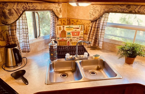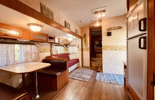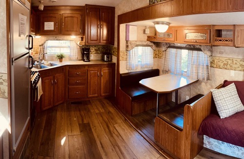 Our cozy Trailer is modified for a more comfortable stay; it has a large external gas tank and a large external water heater so you’re never out of hot water or gas. All electricity you’ll use is generated by solar power. It is a 26 foot long free standing unit with its own outside living area designed for functional relaxation. You’ll have one true bedroom with a queen bed and two potential twin size beds that create a second ‘bedroom’; the couch folds open (this will make a bed that is a bit shorter, at the length of 5’7”, may not be suitable for taller people) and the dining table and chairs transform into a bed as well. The kitchen is fully equipped and has all necessary appliances, there is central heat and air-conditioning and a full bathroom with a toilet and bathtub. You have access to the creek, private deck and a covered patio with a gazebo top housing a charcoal BBQ and a pizza oven.