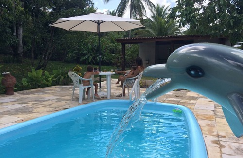 A place that has a bit of everything. There are two hectares of pure green: a garden, many fruit trees, and at least one hectare with a trail in the forest cut by a stream of crystal clear water in the summer. Playground with pogo stick and slide, soccer field, swimming pool with large deck with tables and parasol. Pool support with barbecue, sink and bathroom. The house is colonial style with balconies on all sides. Large living room with sofa, cable TV and broadband internet. Dining room with table for 06 people next to the kitchen equipped with refrigerator, stove and microwave. Service area with washing machine and clothesline. A suite with a double bed and air conditioning; a social room with 01 double bed, 01 single and 02 beds for children with air conditioning; 01 social room with 01 double bed, a single bed and a bunk bed with fan.