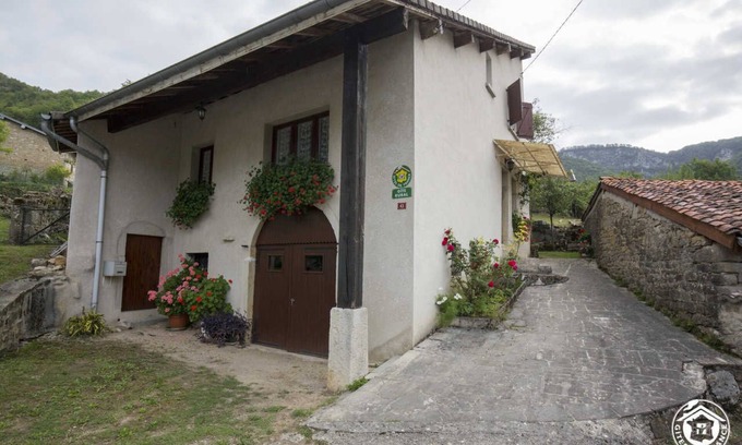 In a typical stone village, large house (140 m²) on 2 levels located in a quiet area, near the Ain river. On the ground floor accessible by 3 steps: fitted kitchen, living room with relaxation area, bathroom. Two steps higher, 2 bedrooms each with 1 double bed, separate toilet. Upstairs: 2 bedrooms: 1 bedroom with 1 double bed and 1 bedroom with 2 single beds, bathroom, separate toilet. Central heating. Garage (washing machine, freezer). Enclosed land. Very nice view on the mountain. Hiking trails marked on site. To discover: the Gorges de l'Ain, fishing, natural site, Chambod leisure center (9km), nature raid (8km): tree climbing, Ain river. Compulsory cleaning charge.