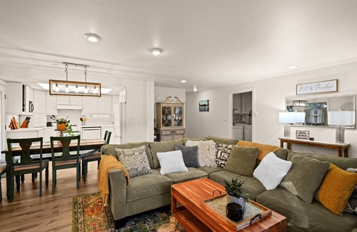 We offer contemporary comforts with captivating ambiance. An expansive open floor plan houses the living and dining spaces, accommodating up to 10 individuals. We extend complimentary treats including snacks, a bottle of wine and sparkling water, popcorn, and a s'mores kit for the firepit. Should you require any specific amenities during your stay, please inform us, and we will gladly accommodate your needs.