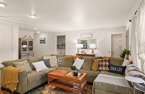 The Living Room: Make your stay comfortable as you enjoy the sectional sofa, lots of cozy blankets, and a 55" flat screen TV (sign in with your personal login information for access to Netflix, Hulu, Prime, Disney+, etc.).
