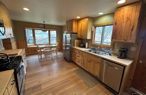 This six bedroom lodge is on 20 very private acres just four miles outside of Heppner Oregon. There is a barn and corrals on the property for horses. There are terrific roads in this area for motorcycling, sports car driving and bicycling. The upstairs has Slate floors thoughout. This is a great place to relax on the deck, with a creek running through the property. You can view and abundance of wild life, including many deer, pheasant and chuckar on the property. Lodge is Dog Friendly and has a 65" smart tv with Dish satellite and high speed internet. You can watch wildlife on the patio or binge Netflix in the lodge.