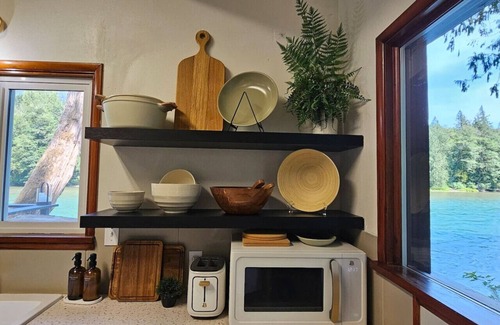Wake up each morning to the serene sounds of the Skagit River flowing just outside your window and soak in the panoramic vistas of the rugged mountain landscape. The Riverhouse is a 1 bedroom, 1 bathroom house that boasts mid-century modern architecture and is designed to offer comfort, charm, and functionality. It features all the amenities a guest would want including a fully equipped kitchen (sans dishwasher), a well stocked coffee/tea bar, ample toiletries & grooming essentials, plush cotton bedding, towels, and throw blankets, perfect for snuggling on the comfy sleeper sofa infront of the gas fireplace. The livingroom also features a large TV connected to wifi, a desk with various charging ports, a variety of games & puzzles, and the best reading nook with views of the river!