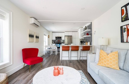 Recently renovated, the apartment is very fresh and welcoming. Up a couple of stairs features 2 bedrooms with a queen bed and bunk beds with Endy mattresses for a relaxing nights sleep. The principle bedroom with the queen bed has a dresser with closet combo to hang your belongings. The second bedroom contains a set of twin over full bunkbeds with a separate storage staircase. The full bathroom features a nice tub to soak in and laundry facilities are located in the kitchen.