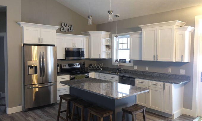 Your experience at Ski Bunnies Crystal Mountain Chalet is enhanced by its impressive amenities and features. The property boasts four spacious bedrooms and three full baths, including a luxurious master suite complete with a walk-in ceramic tile rain shower. The open-concept design allows for seamless flow between the fully appointed kitchen and living areas, perfect for entertaining guests. Gather in the finished basement for some fun with a pool table, or enjoy cozy evenings with complimentary S'mores kits and welcome baskets filled with snacks and beverages to make you feel right at home.