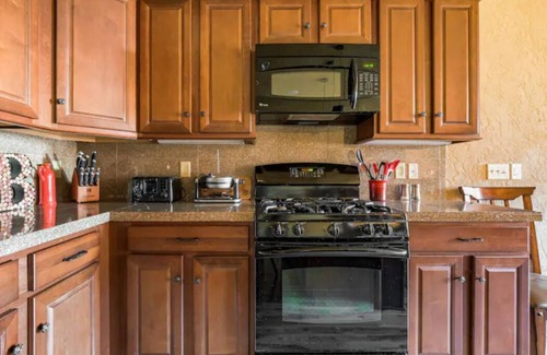 Upstairs, you will find a spacious master suite with a queen bed and a FLAT SCREEN TV. This suite has an amazing gas fireplace that you can kick on right before bed.. or step out onto the private balcony and see if you can spot the windmills in the distance that power the county. The very large master bathroom has a soaking tub, double sinks, private water closet, and a shower fit for a king.