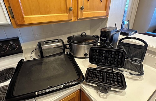 3 bedrooms, 3 1/2 bath. 3 levels. Middle level includes kitchen, dining, family room with open floor plan (small couch has single bed sleeper). King in master, queen in guest room upstairs. 2 bunk beds (sleeps 4) and trundle bed in downstairs kids room. Laundry machines are also down stairs in the kids hallway.