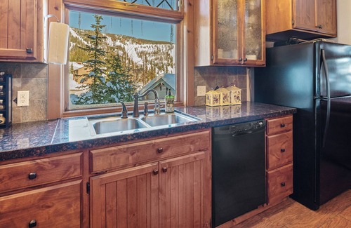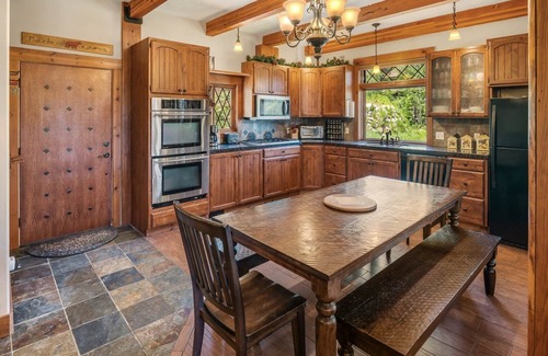 Inside, you’ll find plenty of space for everyone to relax and play. With its warm, inviting Great Room featuring a crackling fireplace, vaulted ceilings, and even an upright piano, it’s the ideal spot to gather after a day on the slopes. The gorgeous, fully stocked kitchen with heated wood and stone floors makes cooking a joy—whether you’re whipping up a quick breakfast or hosting a celebratory feast.