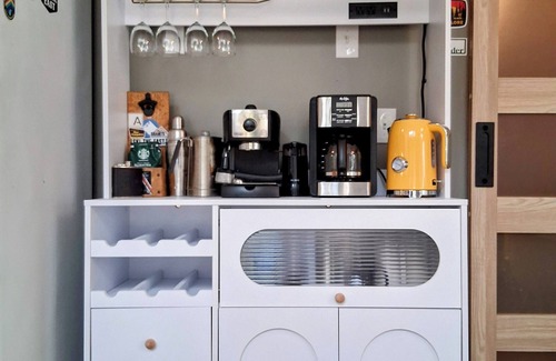 Living room/dining/kitchen: First level open concept with vaulted ceiling, 6 skylights, working fireplace and private deck off the back. Living room couch folds down into a single bed if another first level sleeping space is preferred/needed. Fully stocked kitchen (cooking ware and utensils), fridge with freezer, microwave, coffee makers (espresso and drip), water kettle. Dishwasher, oven, 4 burner stove, sink.