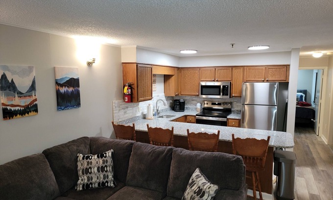 This ski-in/ski-out 1st floor condo is the perfect home base for your trip to Winterplace. With 2 bedrooms + a bunkroom including 2 queen beds, 1 twin bed, and 1 bunk bed, this gorgeous property offers comfortable accommodations for all guests. Enjoy the convenience of WiFi, coin laundry, heating, and AC during your stay. The 2 bathrooms with showers provide superb amenities for your relaxation. We're happy to assist with any questions while you stay at our condo.
