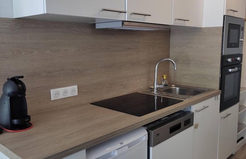 Kitchen equipped with 4 ceramic hobs, refrigerator, microwave, electric oven, Dolce Gusto coffee maker, toaster, kettle, and dishwasher.