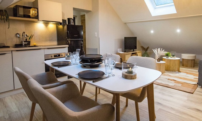 The living room includes a comfortable queen-size sofa bed (160 x 200 cm), perfect after a ski outing or cycling adventure. The open-plan kitchen is fully equipped with a fridge, oven, microwave, dishwasher, filter and pod coffee machines, raclette set, kettle, and toaster. A Smart TV is available to follow the news or stream your favorite content.
