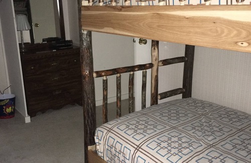 The master bedroom with Queen bed has a large dressing area and its own private half bath. Two other bedrooms on the second floor have new Queen mattresses and upholstered headboard. These 2 rooms share a full bath with tub and shower. Two more can sleep on bunk beds in great room, with a futon also for overflow.